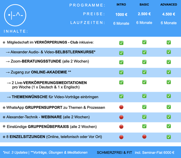 Das INTRO-Programm in KÖRPERBEWUSSTSEIN enthält die Mitgliedschaft im SCHÖNER LEBEN CLUB und seiner Wachstums-Community. Dein Zugang zum Programm kann jederzeit aktiviert werden. Genauso ist es auch mit dem Upgrade auf die BASIC - (mit intensiver Gruppenarbeit) oder ADVANCED - Version (mit individueller & Gruppenarbeit).